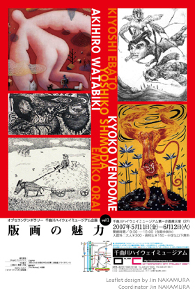 日本版画協会展(以後毎年)・東京都美術館(上野) 全国大学版画展[買上げ賞] 町田市立国際版画美術館(町田) 1997/創形美術学校版画科研究課程修了 個展・みゆき画廊(銀座) 第3回鹿沼市立川上澄生美術館木版画大賞展・川上澄生美術館(鹿沼市) Night Walker Annual National Juried Art Exhibition-benefiting Native American on reservations[Honorable Mention with Award 特別賞]・ Fort Collins Museum(アメリカ) 2nd International Triennial of graphic art・BITORA(マケドニア) 第5回国際交流展1997Milano-Tokyo[奨励賞](ミラノ・東京) 1998/第12回多摩秀作美術展[3席佳作]・東京都青梅市立美術館 3nd International Biennial of small format print・Art Gallery Sunce(ユーゴスラビア) 1999/第13回多摩秀作美術展[準大賞]・東京都青梅市立美術館 第1回池田満寿夫記念芸術賞展・東京国際フォーラム・大阪WTCホール(東京・大阪) 2000/個展・みゆき画廊(銀座) 2001/21人の版画・みゆき画廊(銀座) 2002/日本版画協会展準会員推挙・東京都美術館(上野) 2005/平成17年度新進芸術家国内研修員制度国内研修員(文化庁) 2006/松涛美術館公募展[優秀賞]・松涛美術館(渋谷) 「具象と抽象の狭間に陥った者達」展/プロムナードギャラリー(新宿) シロタ画廊(銀座)にて個展開催 【作品収蔵】 町田市立国際版画美術館/美和町文化の杜美術館 【所 属】 日本版画協会/日本美術家連盟 (その他 NHK教育番組「高校英語講座Ⅰ」放送用版画制作、すずきじゅんいち監督映画劇中版画等) シロタ画廊個展詳細 |