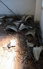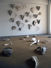 -作品説明- 岡野里香インスタレーション3作目。 私的空間vol.1-風葬-,vol.2-洗骨-に続く今回は「誕生」。 仮想の生物がいた一つの世界が終わりをつげ、長い時間を経てまた新たな生態系が始まる。 向かって左円盤が終末を右円盤が始まりを、壁面オブジェは過去の収集物であり時間経過を表す。 半磁土を焼いた骨の形態のオブジェと苔・乾燥し篩いにかけた土・倒木を使用。 (終末の原因は環境破壊か隕石か核戦争か判明しないが、生態系を終わらせるのは容易い事で、また新たに生物を誕生させるには膨大な時間を必要とする。) |
